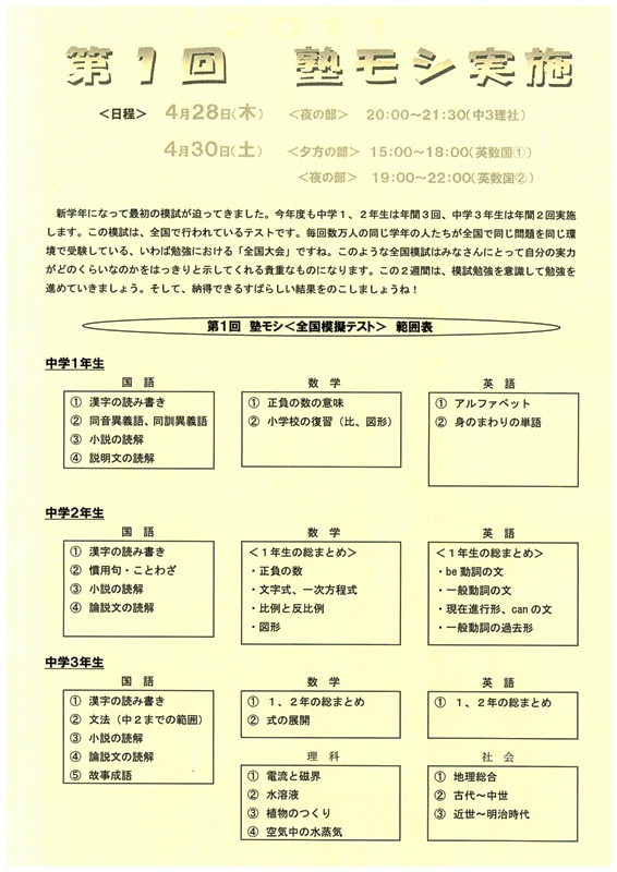 毎年、この時期には、塾模試を実施しております。詳細は保護者通信にてご連絡しておりますので。保護者の皆様はそちらのほうでもご確認ください。