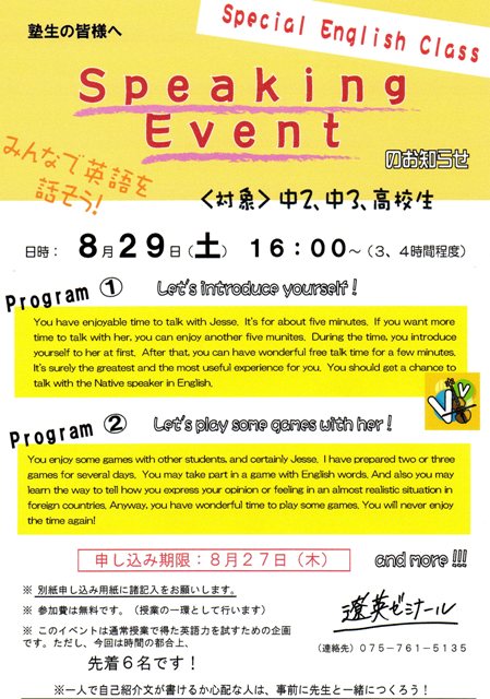 そして懇談週間が終わりますと夏期特別特訓に入ります。懇談の際に配布しております時間割表をご覧頂き、それにあわせて来てください。よろしくお願いします。